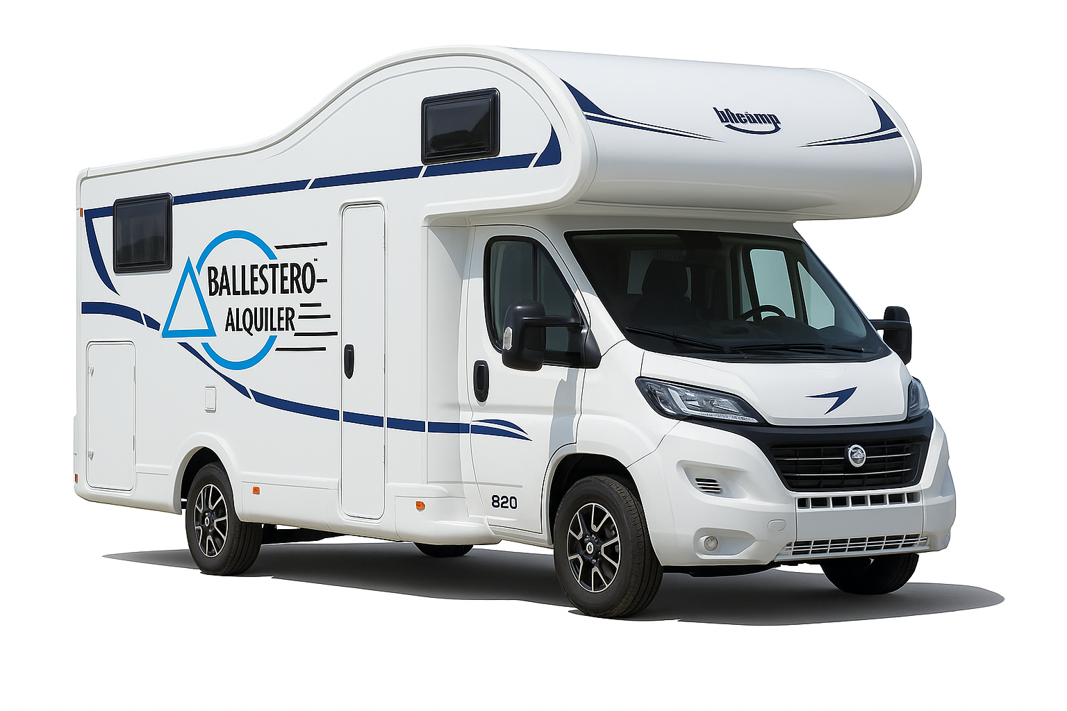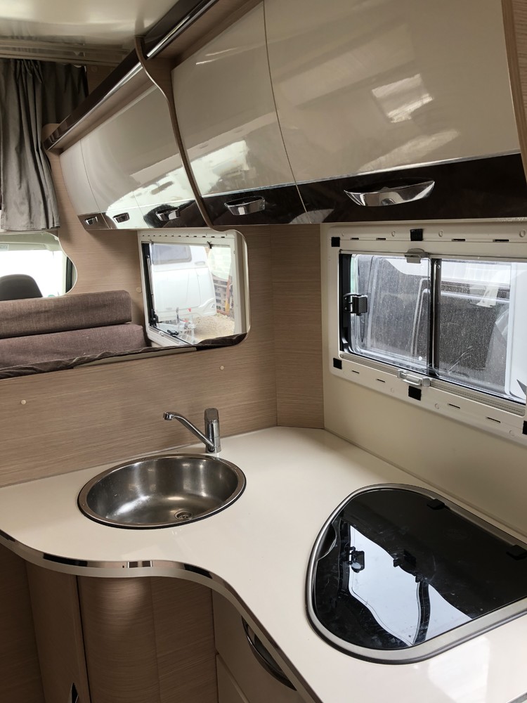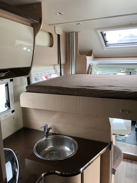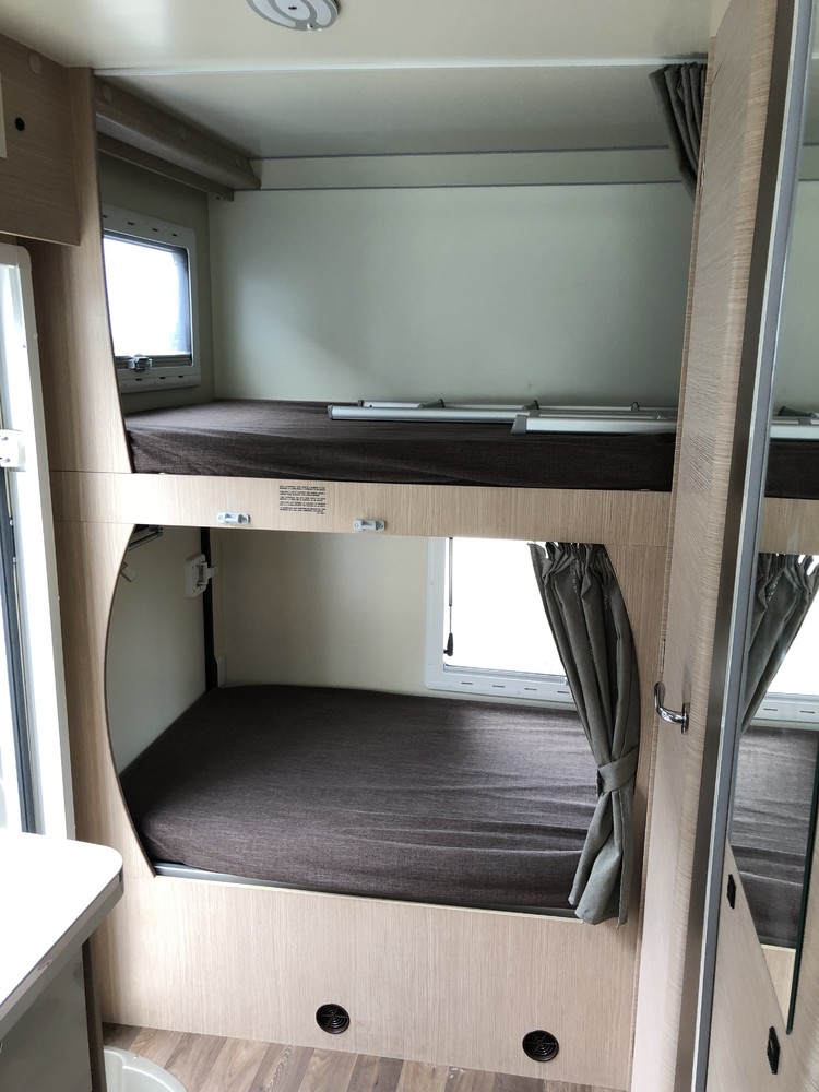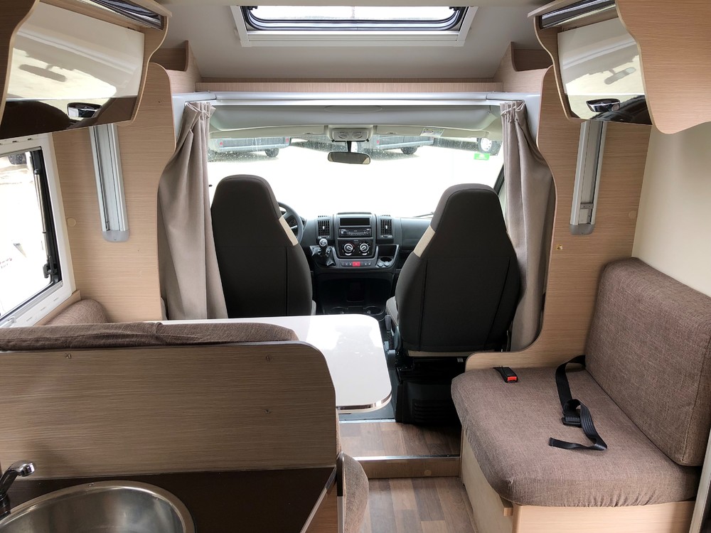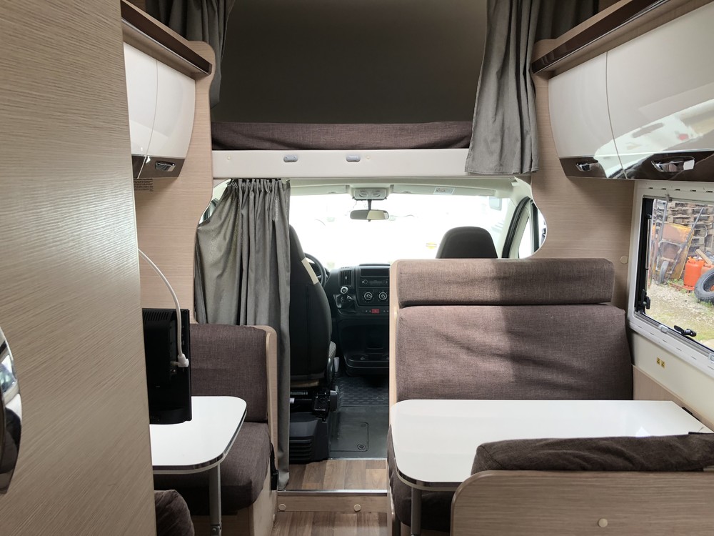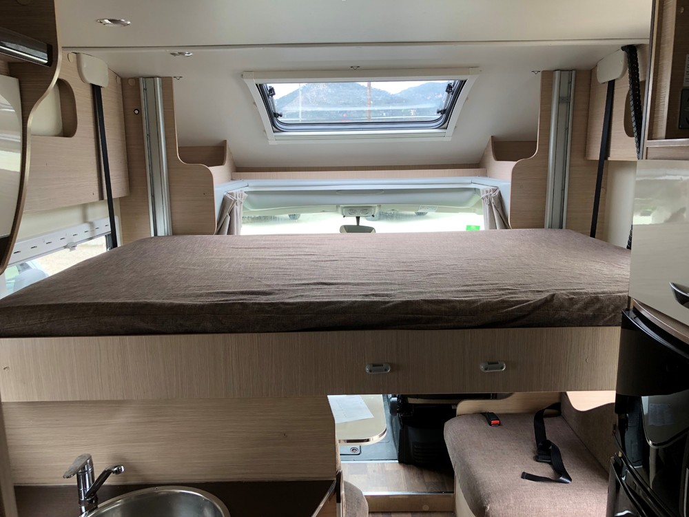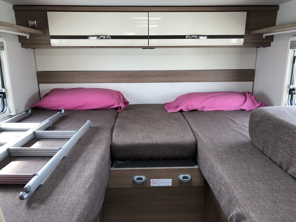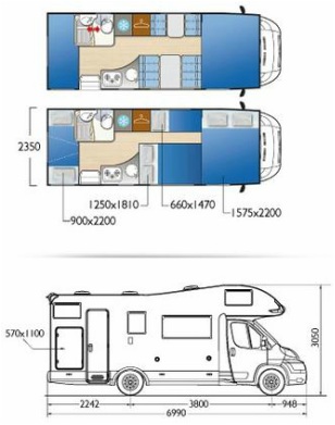 Autocaravana tipo capuchina de 6 plazas compuestas de: cama de matrimonio en la capuchina, literas en la parte trasera sobre un semi garaje, un comedor convertible en cama de matrimonio y otro comedor de dos plazas convertible en cama individual en el centro.
